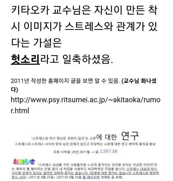 그러나 착시 현상으로 스트레스를 측정한다는 가설은 신빙성이 낮다고 판명 되었다고 합니다.