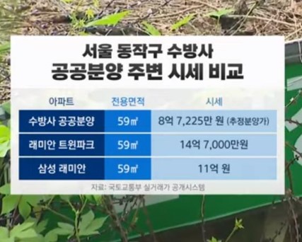 공매 단지라는 점을 감안하면 다소 높은 가격이라는 지적도 나왔다. 전 가구가 전용 59㎡로 구성돼 있으며, 분양 예정가격은 8억7225만원이다. 수방사가 공급되는 남양주 왕죽·안양 매곡 전용 59㎡의 분양가 예상이 3억3000만~4억3000만원임을 감안하면 두 배 이상 높은 수준이다. 다만 주변 시세보다 저렴해 '복권 청약'이라는 평가도 나왔다.