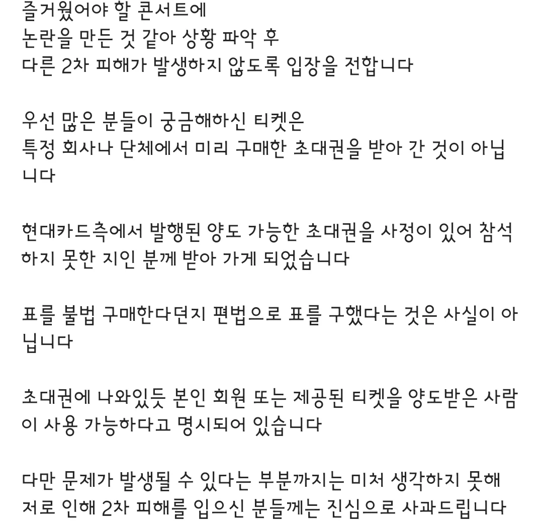 이에 대해 주최사인 현대카드 관계자는 "연예인들이 방문한 좌석은 공연 시 아티스트가 직접 초대한 가족, 친구, 뮤지션 등 지인들을 위한 초대권을 받은 경우나 연예인 소속사에서 구매한 티켓을 통해 방문한 경우에 해당된다"고 설명했습니다. 현대카드는 연예인 초대에 대해서는 직접적인 역할을 하지 않는다고 밝혔습니다.