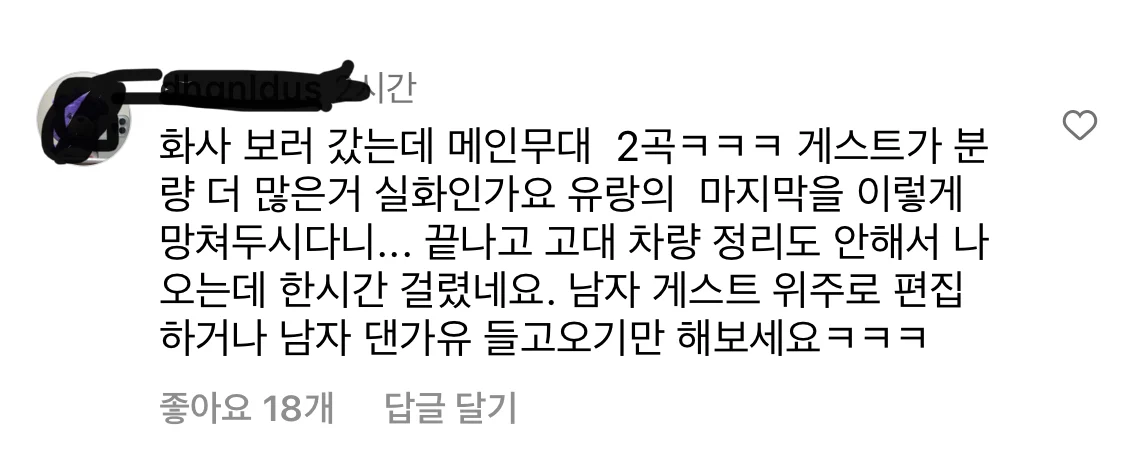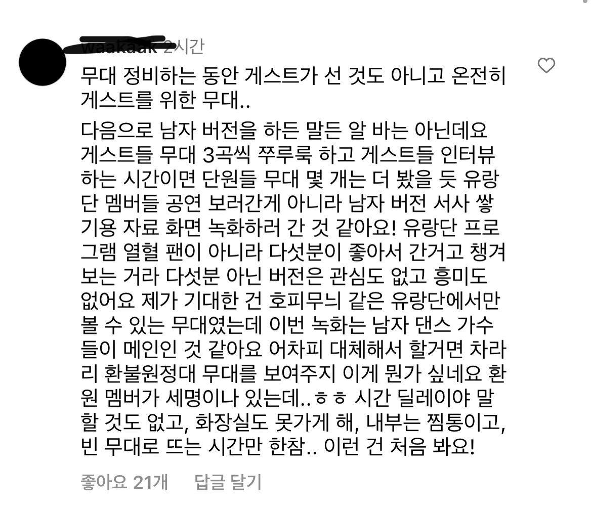- 이따위로 진행하면 5만 5천원은 왜 받나? 유랑단 멤버 보러 간거지 게스트 보러 간건가?