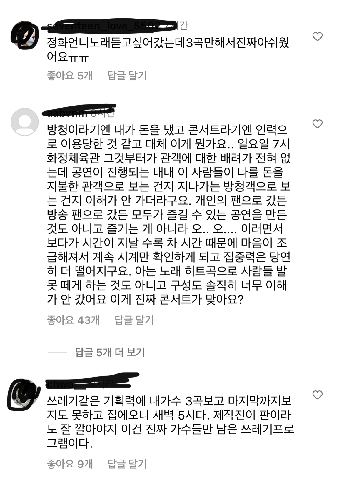 콘서트 시간의 2배가 넘는 시간이 소요 되고 굿즈 가격에 불만도 있었던듯
