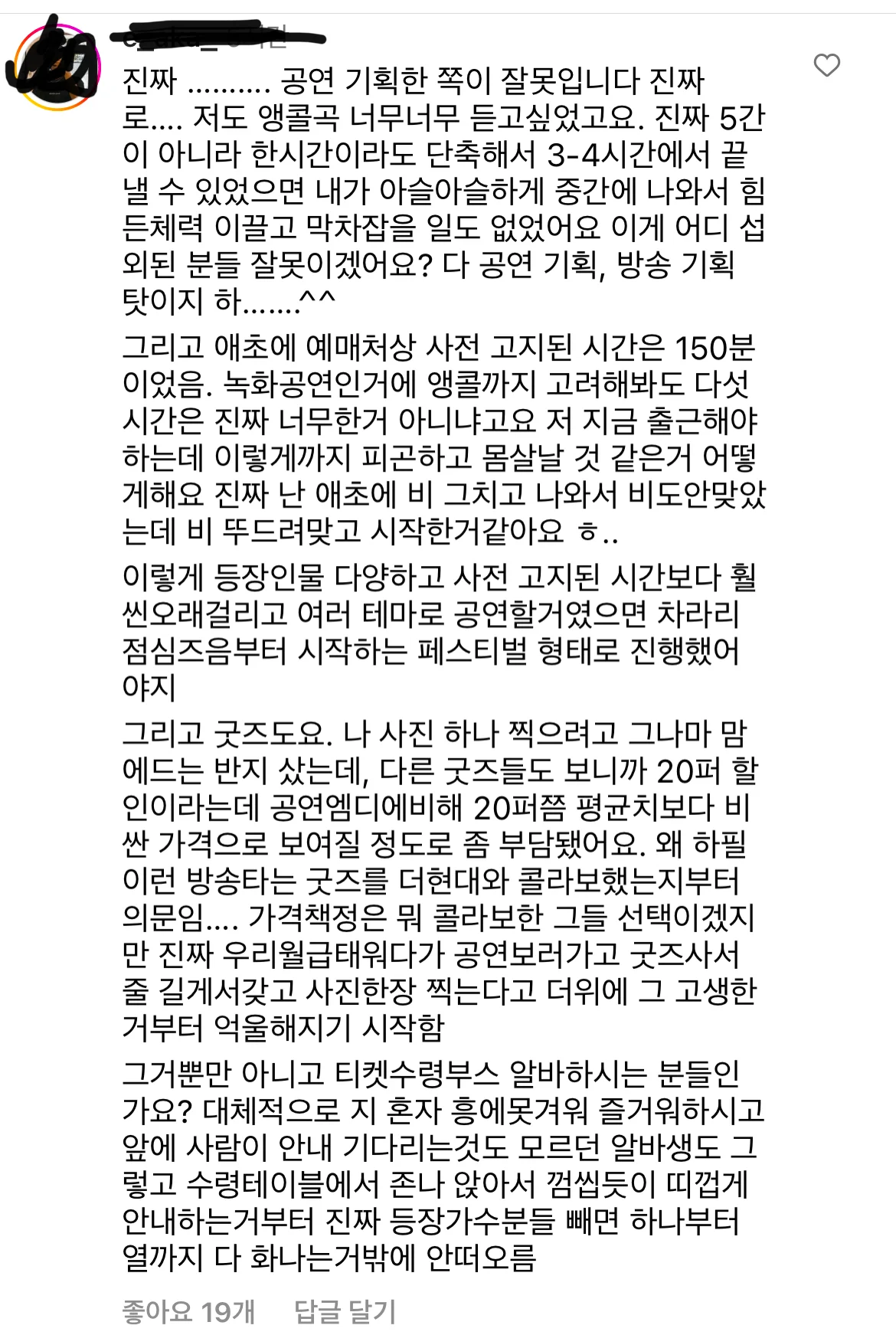 더불어 당일 공연 관람 및 운영에 있어 불편을 드린 점에 대해 죄송한 말씀을 드립니다.