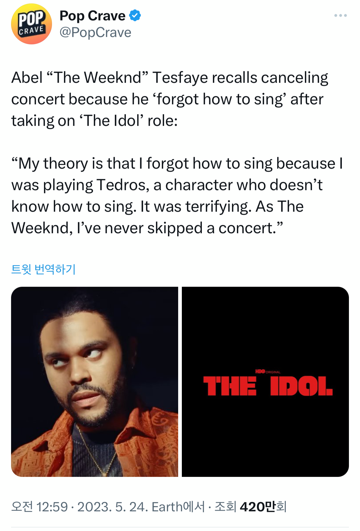 연기 몰입으로 노래하는 법 까먹어 콘서트 중 취소한 가수 대한 글 입니다.